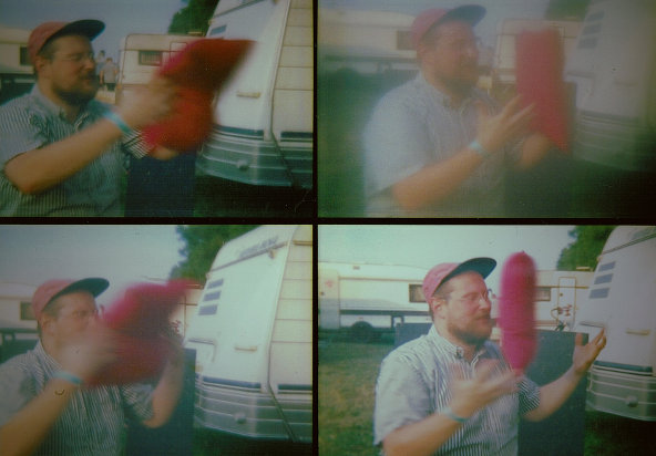 Während die schönste Abendsonne scheint, treffe ich Dan Deacon im gemütlichen Backstage-Bereich des Haldern Pop Festivals. Da Dan den Eindruck macht, als sei er für jeden Spaß zu haben, bitte ich ihn gleich um ein Foto – und zwar eins mit der Lomo-Kamera, die vier Bilder hintereinander schießt. Dan ist begeistert und hat auch gleich eine Idee: "Ich werde mir dieses pinke Kissen ins Gesicht schmeißen!" – gesagt, getan: auch, wenn man mehr Pink als Dan sieht, ist unser Experiment geglückt.