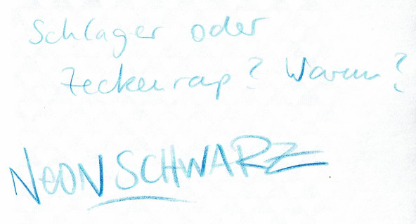 "Wollen wir einfach aufschreiben: 'Wie seid ihr auf euren Namen gekommen?'", schlägt Johnny vor und alle prusten los. Die Frage mussten Neonschwarz einfach schon viel zu häufig beantworten, also wollen sie auch niemand anderem antun sie zu beantworten. Also denken sie nach: Von Yvonne Catterfeld und Sookee, über Philipp Poisel und Fatoni kommen Neonschwarz schließlich auf die Frage: "Schlager oder Zeckenrap?". Die Antwort ist ganz klar: "Schlager!" rufen die drei fast im Chor. "Zeckenrap ist so eine Schublade, wir haben keinen Bock auf Schubladen, darum sagen wir Schlager", erklärt Johnny die einstimmige Meinung. Einen Schlagersong haben Neonschwarz sogar schon im Kasten, haben sich aber nicht getraut, ihn auf "Metropolis" zu veröffentlichen. Also, nicht schockiert sein, wenn ihr demnächst Neonschwarz im Musikantenstadl zu sehen bekommt!